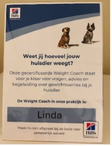 Om dit te voorkomen willen wij graag als Dierenkliniek Cato jou en je huisdier hierbij helpen. Vaak weet een eigenaar niet eens dat zijn hond of kat te zwaar is of is zich hier niet van bewust. Dit is ook helemaal niet erg en we zien dan ook veel eigenaren, die goed gemotiveerd zijn om hiermee aan de slag aan te gaan. Onze paraveterinair Linda heeft een training gevolgd om zich te specialiseren in voeding en het verliezen van gewicht bij de hond en kat en mag zich daarom officieel gewichtsconsulent noemen. Samen met Linda ga je met je huisdier aan de slag. De enige voorwaarde van de WeightDate is wel dat de eigenaar bereid is om met speciaal dieetvoer te starten.